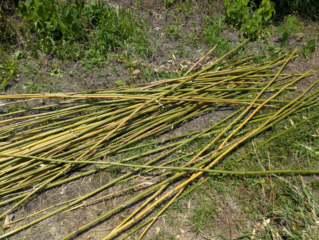 分をカットして約200 本の支柱を作成しました。ナタを持って里山に竹を取りに行き、必