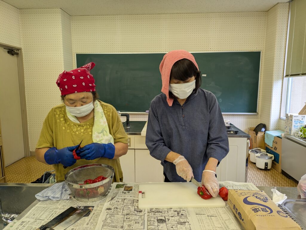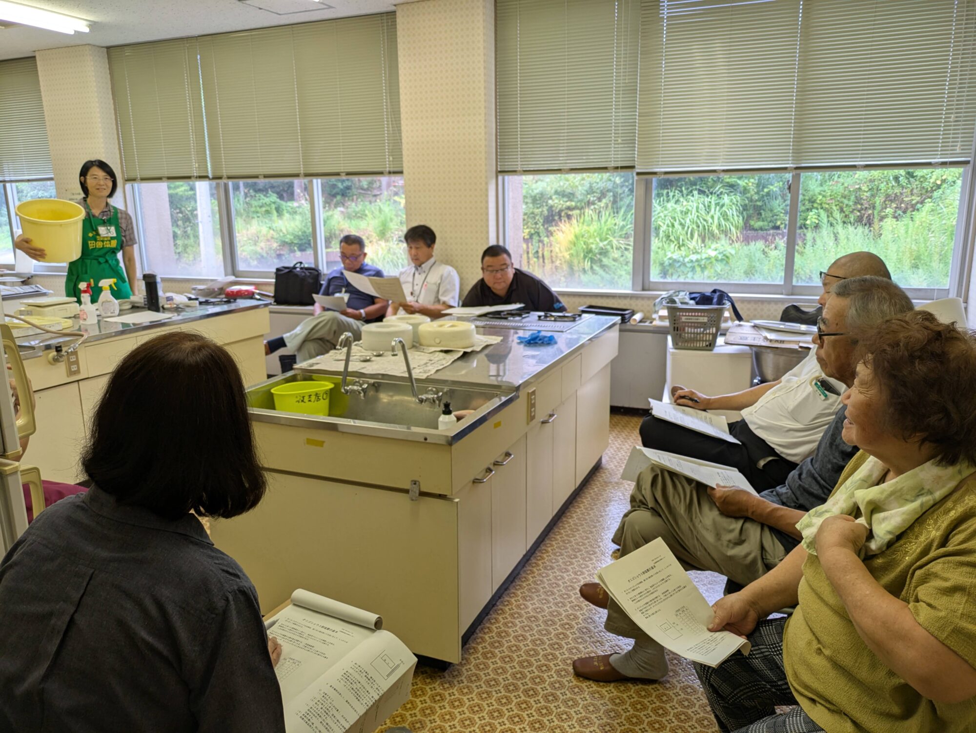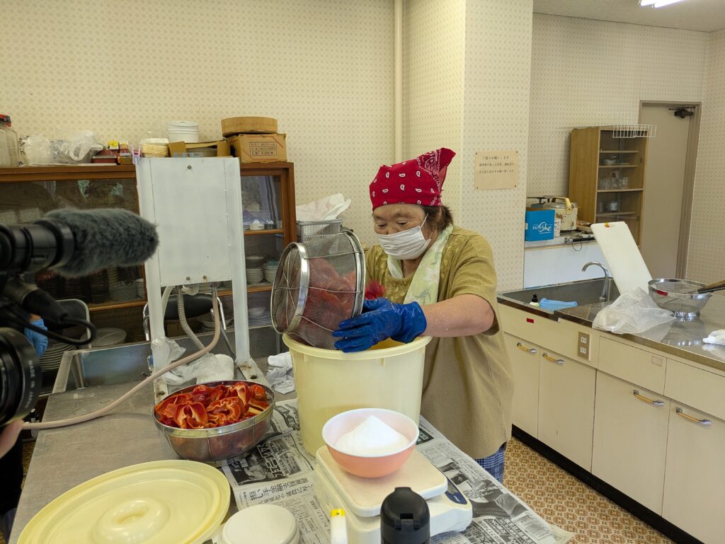 勉強会では、ベテランのおかあさん達に、切り方のコツやうまく塩蔵するためのポイント